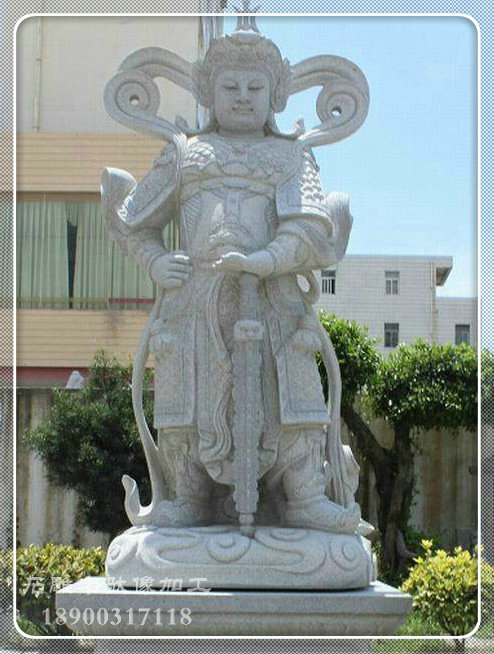 在中國的寺院殿宇里原印度血統(tǒng)的韋馱已經(jīng)被漢化,成了一名地道的中國武將,他身披鎧甲,手持金剛杵,降魔去妖,威風(fēng)凜凜英俊威武。天王殿中所塑的韋馱形象,一般具有兩種站立的姿態(tài):一個(gè)是雙手合十,降魔杵橫于腕上,直挺而立;一個(gè)是一手握杵拄地,另一手叉腰。前者雙手合十,表示此地是十方叢林,歡迎來客,遠(yuǎn)游的行腳僧可安心住下。后者則示本寺不接待來僧掛單,行腳僧最好另投山門。