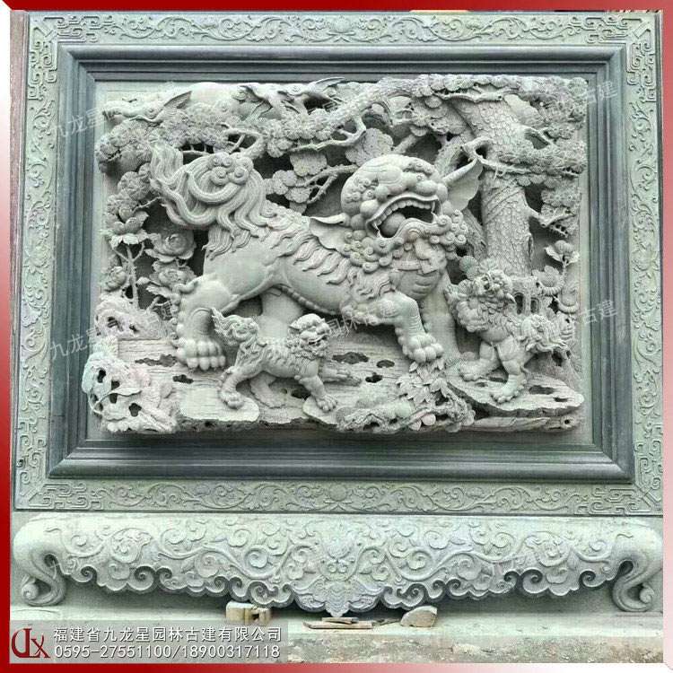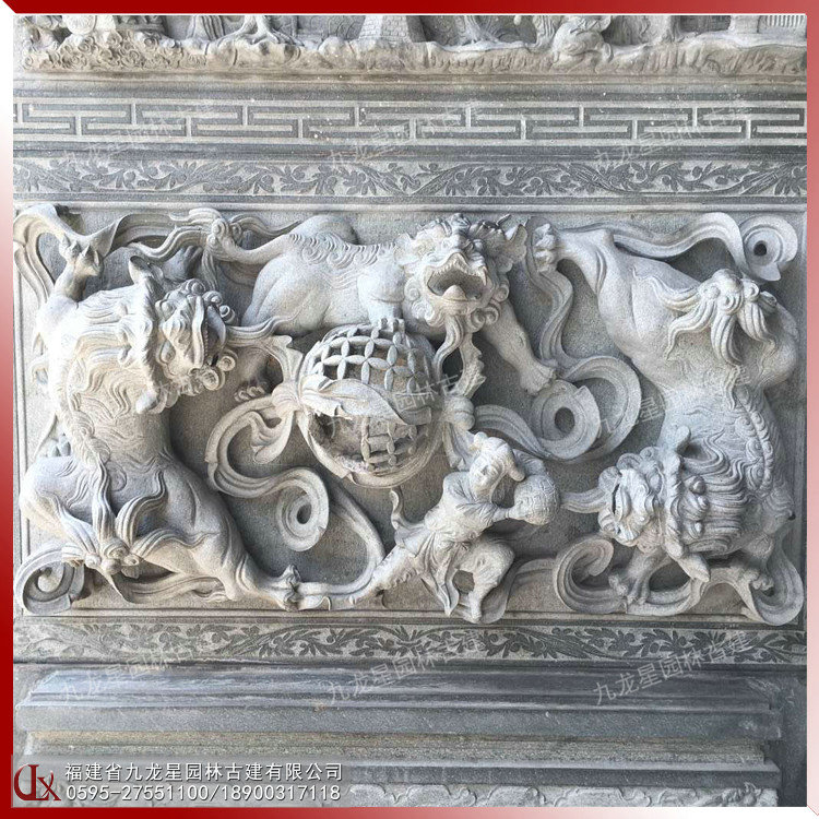 獅子滾繡球 青石浮雕獅堵圖片 寺廟浮雕壁畫制作